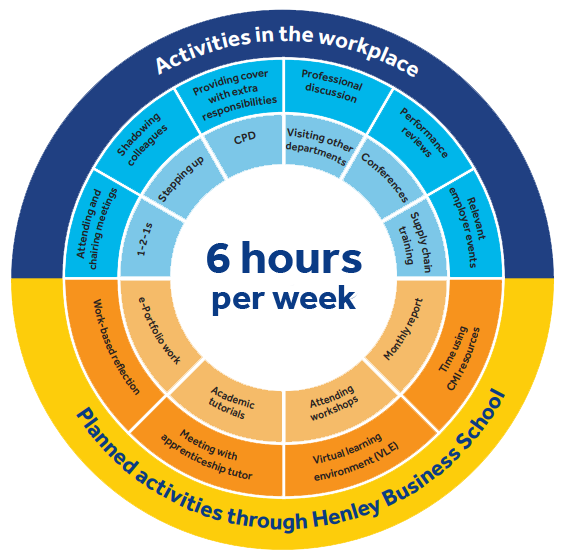 Henley provides apprentices with a full programme of activities that deliver learning and contribute to the requirement for off-the-job training (see lower half of Figure 2 - click to enlarge). Typical activities include: